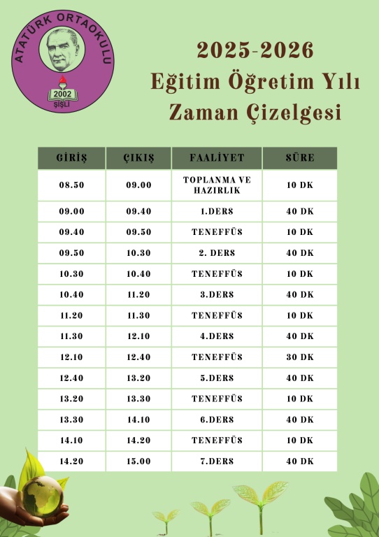 2025-2026 EĞİTİM-ÖĞRETİM YILI OKUL DERS ZAMAN ÇİZELGESİ