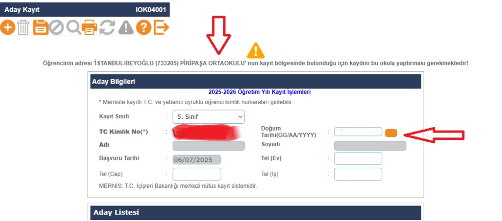 MİLLÎ EĞİTİM BAKANLIĞI OKUL ÖNCESİ EĞİTİM VE İLKÖĞRETİM KURUMLARI YÖNETMELİĞİ MADDE 11' e göre veli okula gelip istenen bilgi ve belgeleri ibraz edip Okul Müdürüne Kimlik Bilgileri (Ad Soyad-TCKNO-Doğum Tarihi) ve adres kontrolünü yaptırmadığı müddetçe öğrencisi aday kayıttan kesin kayda alınmayacaktır.